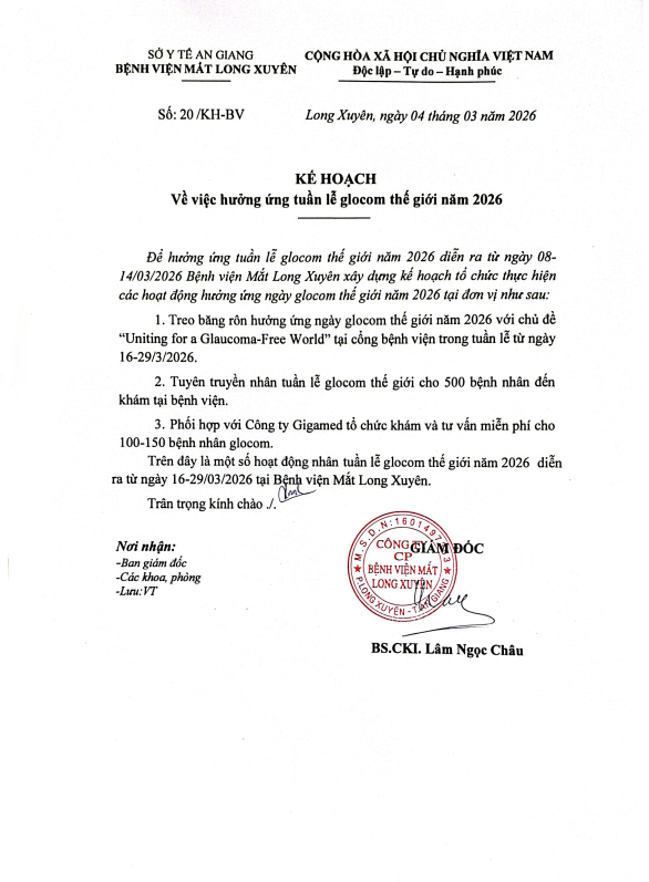 KẾ HOẠCH: Về việc hưởng ứng tuần lễ glocom thế giới năm 2026 của Bệnh Viện Mắt Long Xuyên